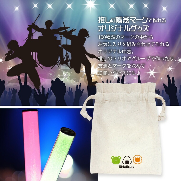| 商品について | 100種類以上のマークの中から好きなマークを組み合わせて作れる巾着! 推しのマークで概念グッズが簡単に作れちゃう♪ マークの種類は続々増加中! |