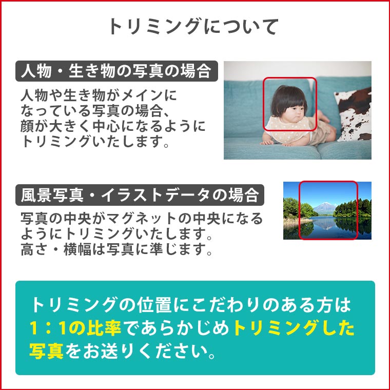 | 商品について | お子さまや思い出の写真、オリジナルのイラストなどをマグネットにして飾りませんか? 透明度の高いクリアアクリルにで色鮮やか♪ 4個それぞれ別の写真で作れるからいろいろ楽しめちゃいます! プチギフトにもおすすめです |