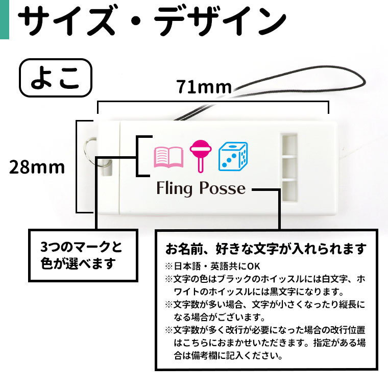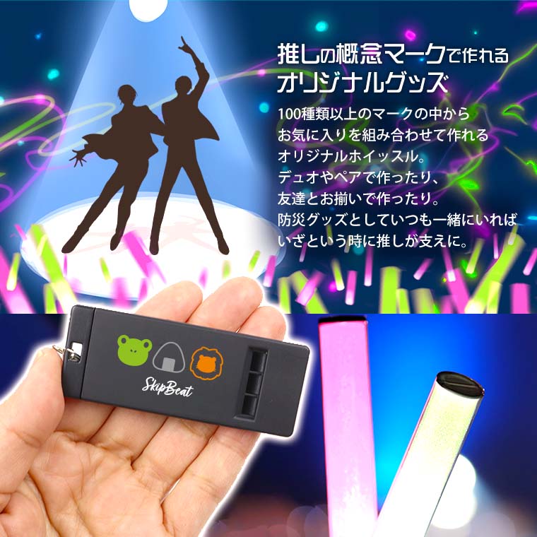 | 商品について | 100種類以上のマークの中から好きなマークを組み合わせて作る自分だけのホイッスル! 推しのマークで概念グッズが簡単に作れちゃう♪ マークの種類は続々増加中! 薄型のホイッスルだから、いつものバッグにもつけやすいです |