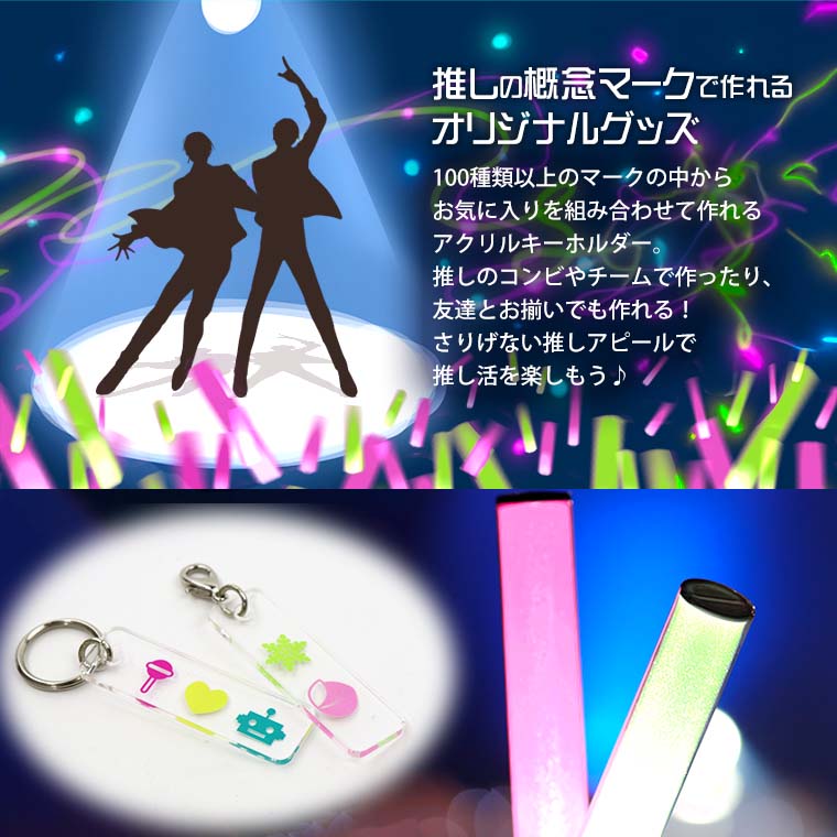 | 商品について | 100種類以上のマークの中から好きなマークを組み合わせて作れるキーホルダー! 推しのマークで概念グッズが簡単に作れちゃう♪ マークの種類は続々増加中! |