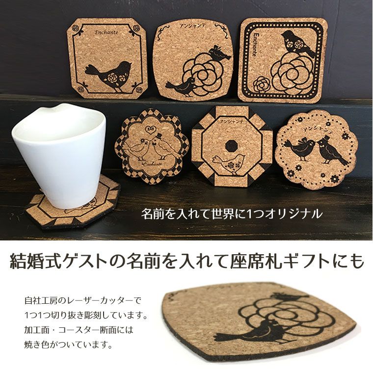 コルク製 幸せを呼ぶコースター 小鳥デザイン 全6種 アンシャンテラボ / 名入れ 干支 酉 ことり コトリ 結婚式 ギフト席札 ウエディング ノベルティー 丸 四角 花型 フラワー【ゆうパケット対応】