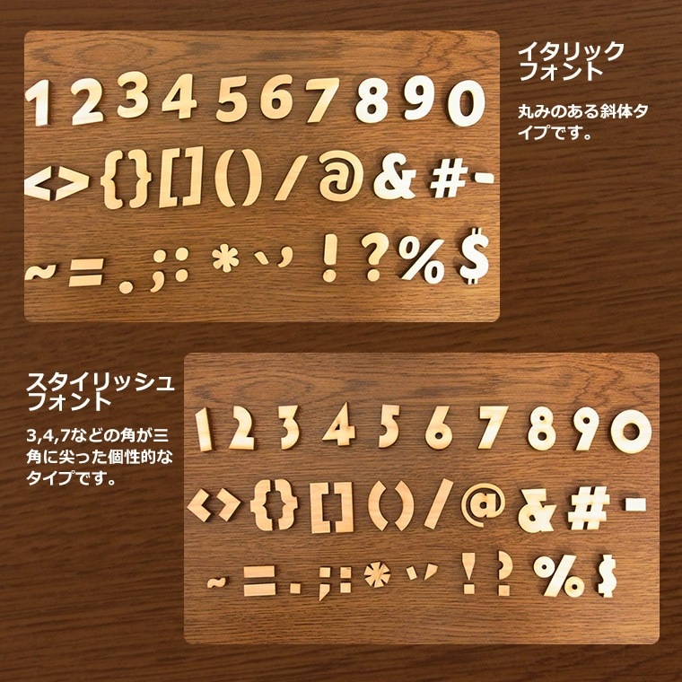 | 商品について | 切り抜き文字のパーツです。手作り、物作りにご利用ください。アルファベットやマークと組み合わせてオリジナルプレート作りなどに。 |