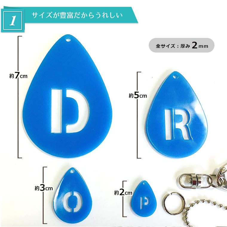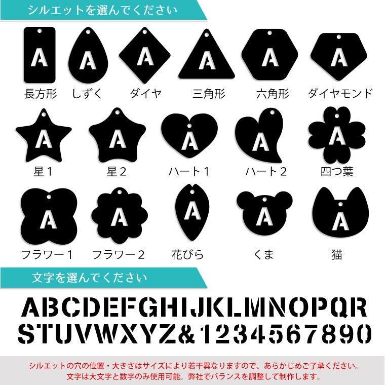 | 商品について | いろんな形のアクリル板からアルファベットをくりぬいたパーツです。マルカンとカニカンを付けてチャームするのもおすすめ。サイズ違いや色違いの組み合わせも可愛いですよ♪ |