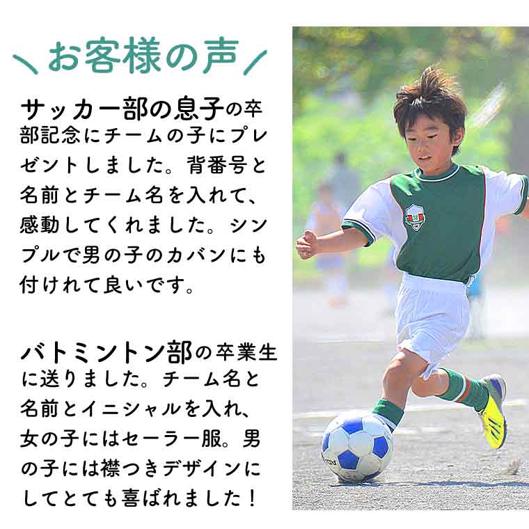 | オーダー内容 | ①おもて面に入れる内容(チーム名) ②うら面の上部に入れる内容(名前) ③うら面の下部に入れる内容(背番号) ※上記はご注文手続き時にご記入ください。 |