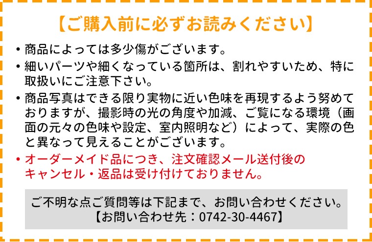 ●当商品のオーダー内容のみをご記入ください。納期に関するご質問やその他のご質問は、ご注文手続きを進める中で表示される備考欄にご記入ください。