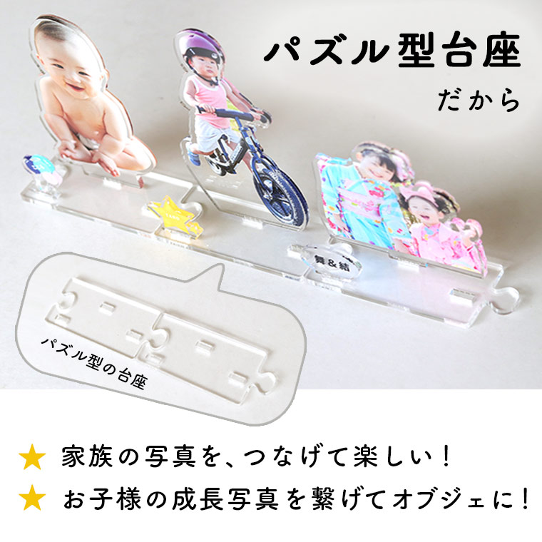 | 商品について | 写真を送るだけで名前入りオリジナルフォトスタンドが完成! つながる台座なので、子供の成長や記念日を迎えるごとに増やしていけます。 アクリルスタンドなら、インテリアとして写真を飾るのに最適です。 お部屋や会社のデスクに家族や大切な方を飾りませんか? |