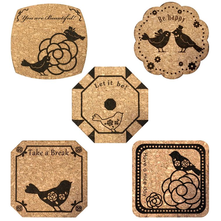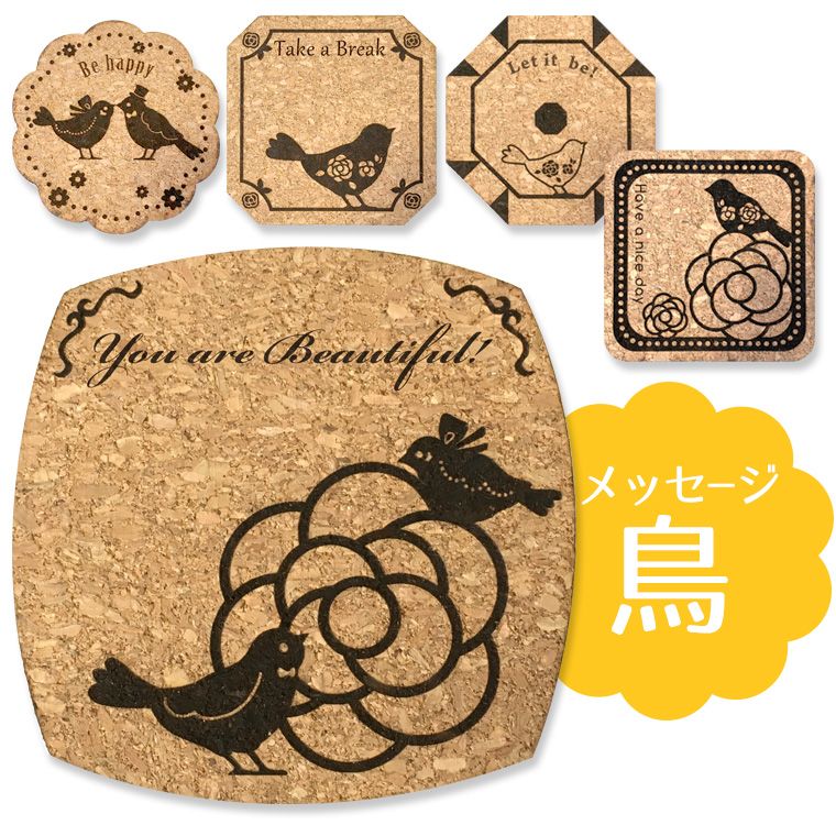 幸せを呼ぶコースター コルク製 小鳥デザイン 全6種 アンシャンテラボ / オリジナル商品 名入れ 干支 酉 ことり コトリ 結婚式 ギフト席札 ウエディング ノベルティー 丸 四角 花型 フラワー【ゆうパケット対応】 253(税込)