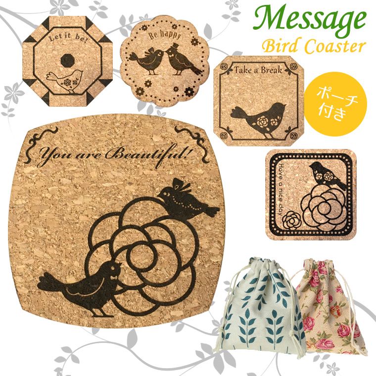 メッセージ入り鳥コースター 5種セット 選べるポーチ付き / コルク製 花柄 小鳥デザイン ことり バード bird プレゼント 贈り物【ゆうパケット対応】