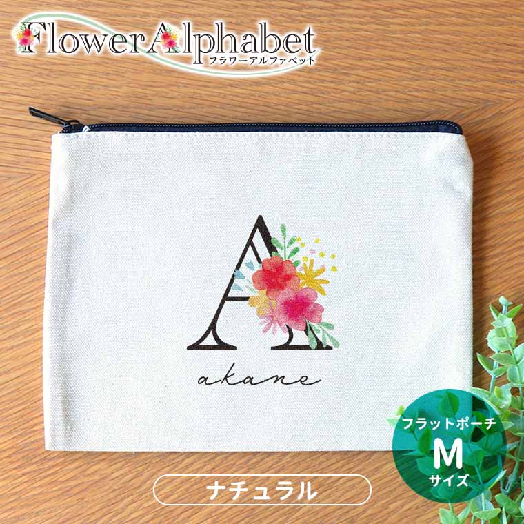 フラワーアルファベット フラットポーチ ナチュラルカラー Mサイズ アンシャンテラボ / オリジナルポーチ オリジナル ポーチ 名入れ アルファベット イニシャル 母の日 プレゼント フラワー オシャレ 可愛い お揃い 【無料メッセージシール付き】【ゆうパケット対応】