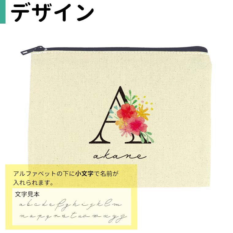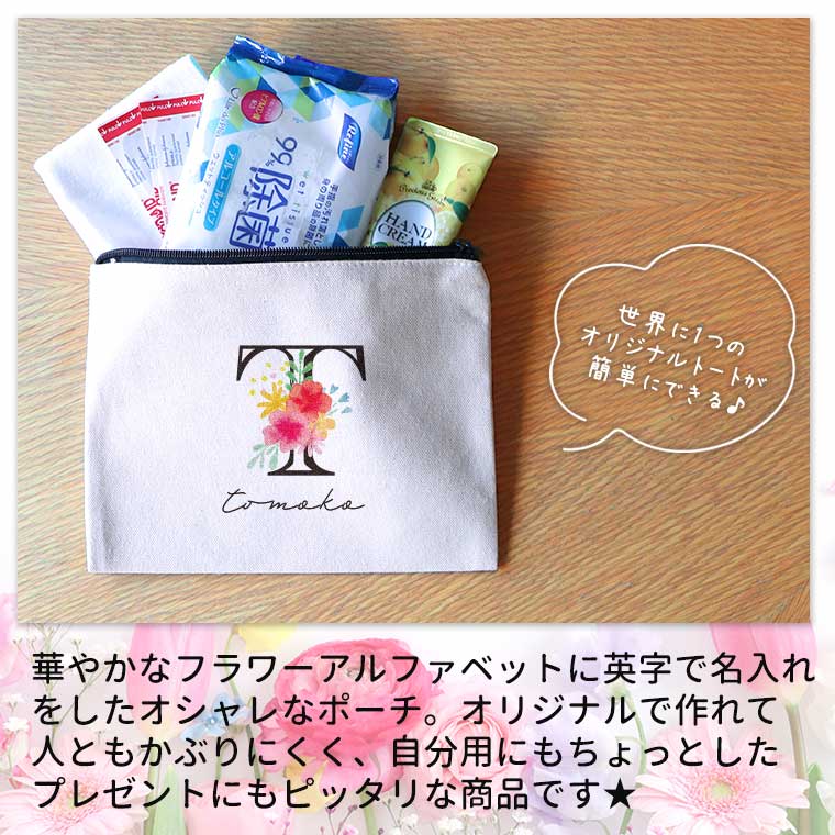 | 商品について | お花をあしらったアルファベットとおしゃれなフォントで入れるお名前で作るオリジナルのポーチ! |
