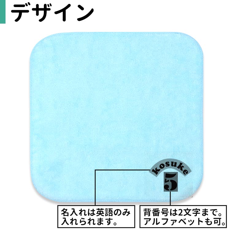 | 商品について | 背番号と名前が入れられるシンプルなハンドタオル。 背番号だけでなくアルファベットも入れられる♪ |