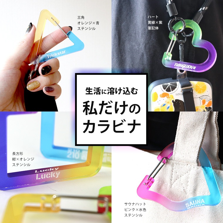 | 商品について | 左右で色が選べるグラデーションカラビナ。 名入れ・文字入れもできるから推し活にもオススメ♪ ※印字があるほうが右側です。 |
