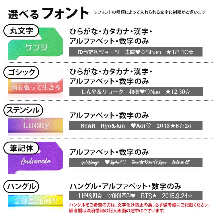 | オーダー内容 | ①印字する内容(フォントにより文字数上限が違います) ※上記はご注文手続き時にご記入ください。 ※文字数の上限については商品画像の「サイズとデザイン」をご確認ください。 |