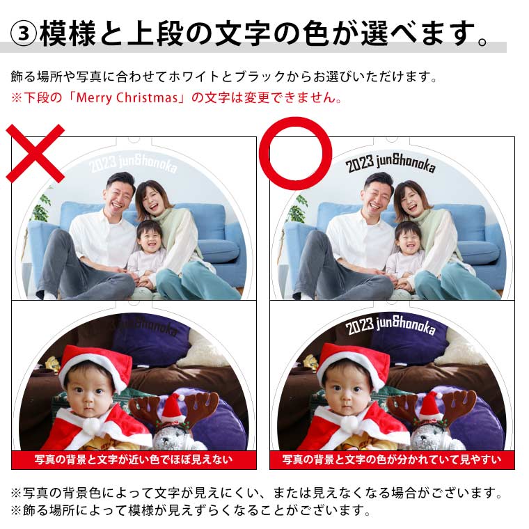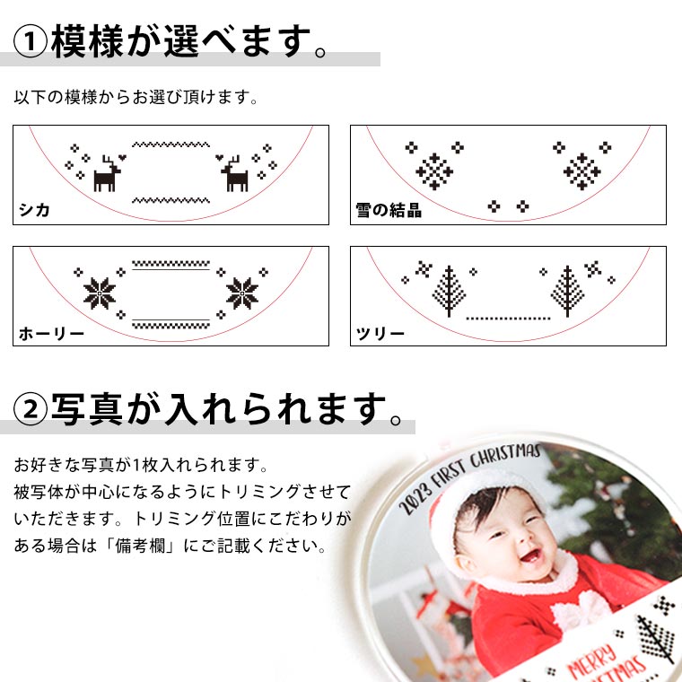 | 商品について | お好きな写真で作るオーナメントを吊るして飾れるスタンド! 玄関やリビングに飾れるオリジナルのアイテムです♪ |