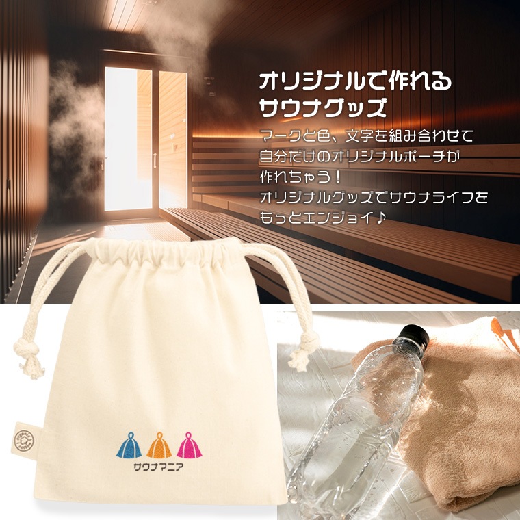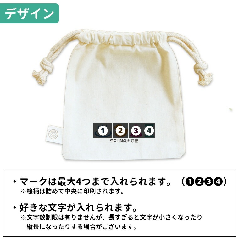 | 商品について | 4種類のマークの中から好きに組み合わせて作れる巾着! 自分だけのオリジナルサウナ巾着でサウナライフをエンジョイ♪ |