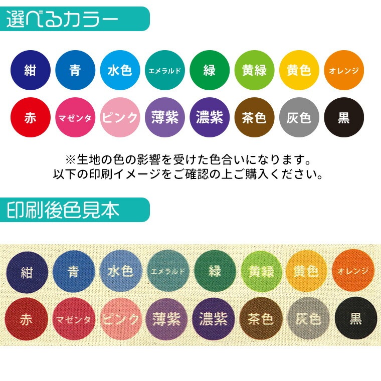 ※仕上がりは生地の色に影響を受けた色味になります。また、白色は印刷されない為、完全に生成り色となります。 ※画像は閲覧環境により実際の色と異なる場合がございます。 ※オーダーメイド品につき、注文確認メール送付後のキャンセル・返品は受け付けておりません。 |