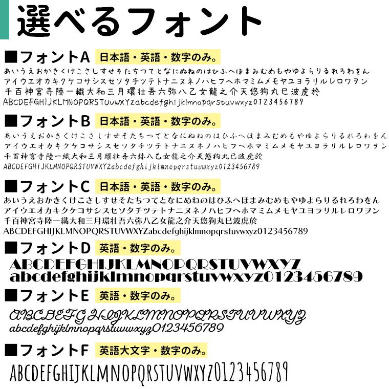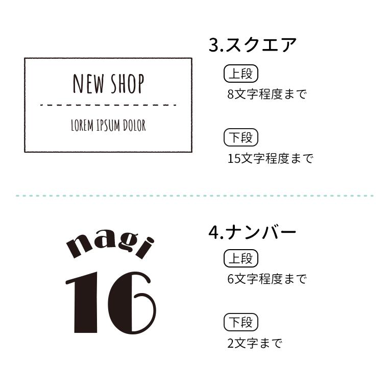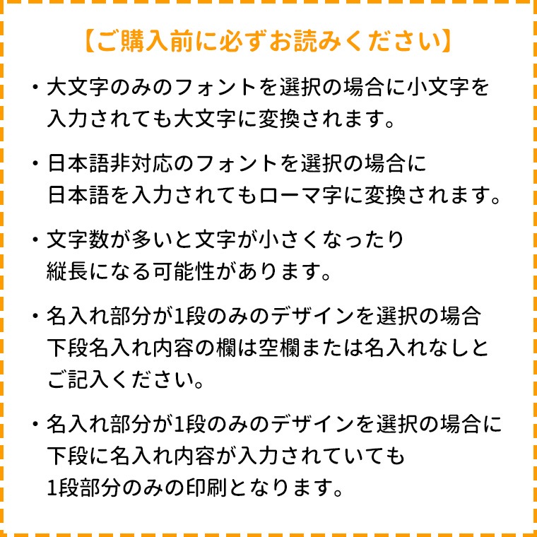 | オーダー内容 | ①ロゴの種類 ②フォントの種類 ③名入れ内容(下段あるものは上段下段わかるように記載ください) ※上記はご注文手続き時にご記入ください。 |