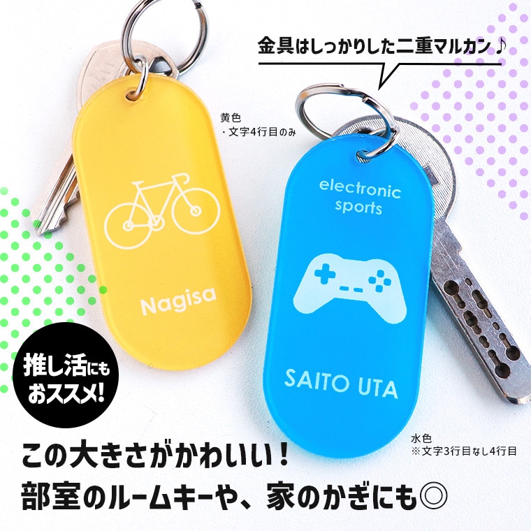 小さなサイズがちょうどいいキーホルダー。 部活のマークや14色からカラーが選べる♪ 4カ所も名入れができるからオリジナルデザイン作って仲間でお揃いに! クリアアクリル+裏打加工で発色鮮やか! 大量注文でも1個からでもお受けします。 |