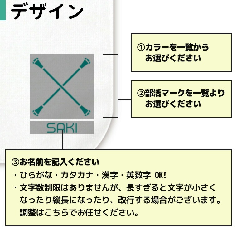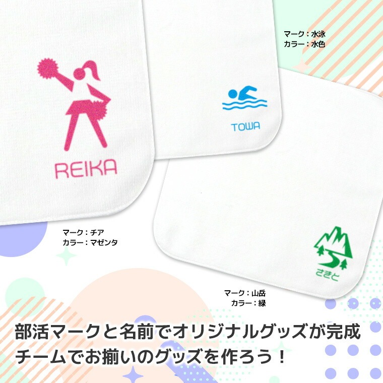| 商品について | 部活マークと名前が入れられるシンプルなハンドタオル。 チームで揃えたら団結力アップ♪ |