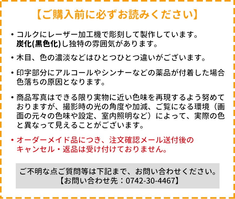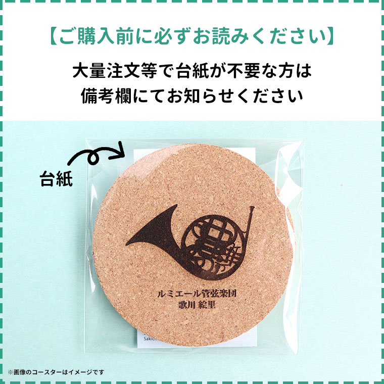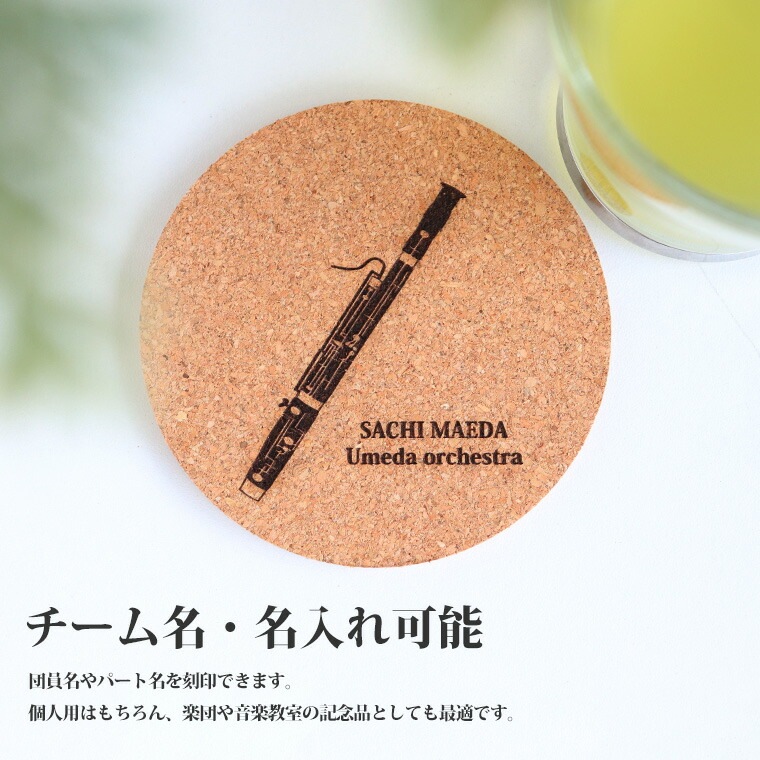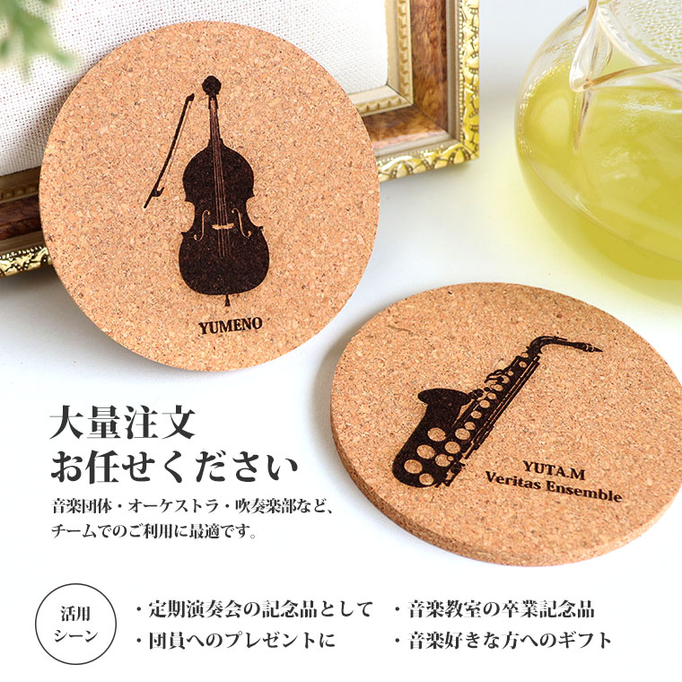 | 商品について | 繊細な彫刻が際立つ、エレガントなコルク製コースター 音楽を愛するすべての人へ贈る、特別な一枚。 ナチュラルで温かみのあるコルク素材を使用。 団員名やパート名を刻印できます。個人用はもちろん、楽団や音楽教室の記念品としても最適です。 大量注文もお任せください。 |