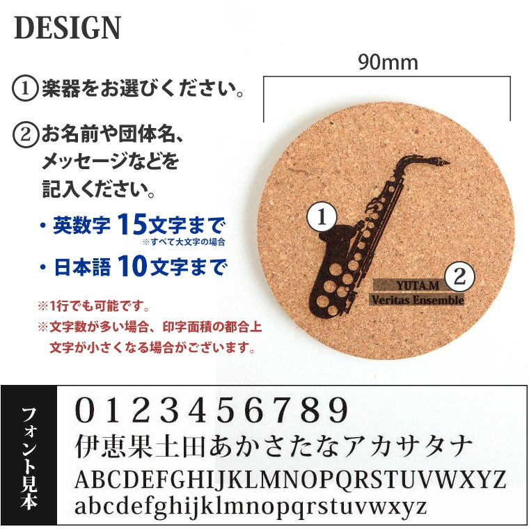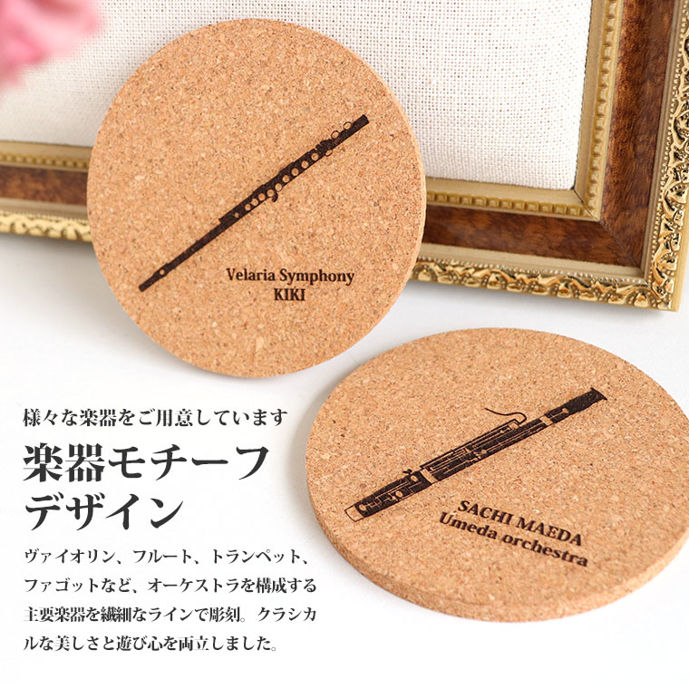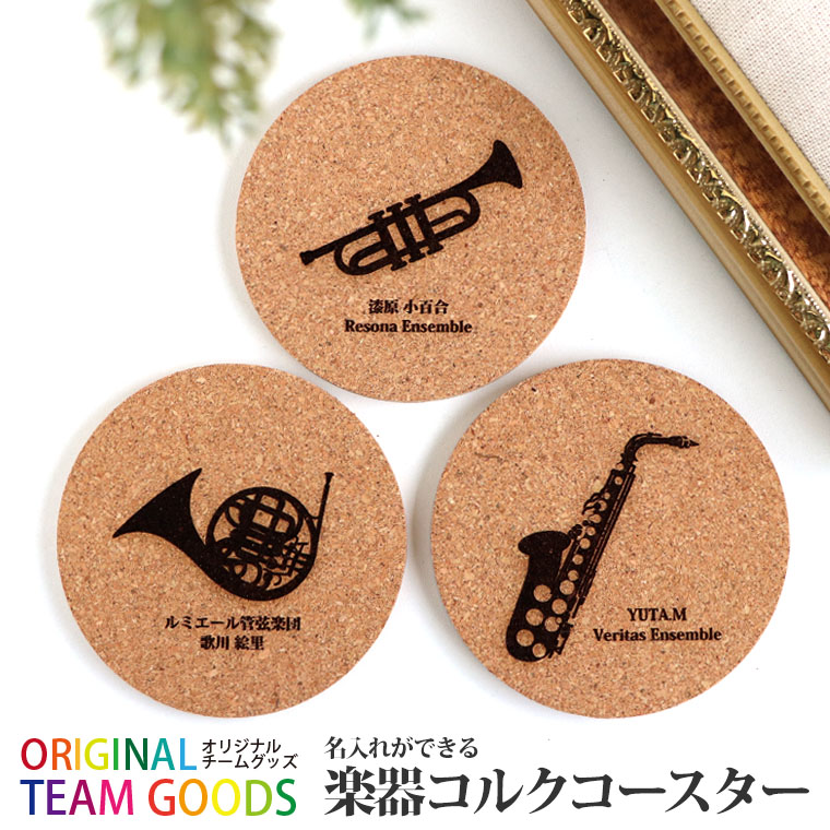 コルク製 楽器コースター 円形 厚さ5mm φ90mm アンシャンテラボ / 楽器 卒業 卒部 卒団 引退 記念品 吹奏楽 マーチング ノベルティ コルク チームグッズ ナチュラル 雑貨 プレゼント 名入れ 文字入れ 団名 【ゆうパケット対応】 385(税込) -