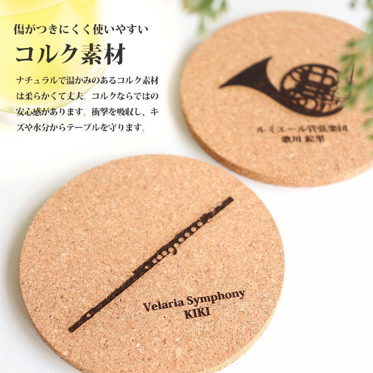 コルク製 楽器コースター 円形 厚さ5mm φ90mm アンシャンテラボ / 楽器 卒業 卒部 卒団 引退 記念品 吹奏楽 マーチング ノベルティ コルク チームグッズ ナチュラル 雑貨 プレゼント 名入れ 文字入れ 団名 【ゆうパケット対応】