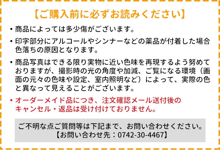 ※画像は閲覧環境により実際のお色と異なる場合がございます。あらかじめご了承ください。 ※文字の配置やサイズはこちらでバランスを見て調整いたします。 ※アルコールやシンナーなどの薬品が付着した場合色落ちの原因となります。 |