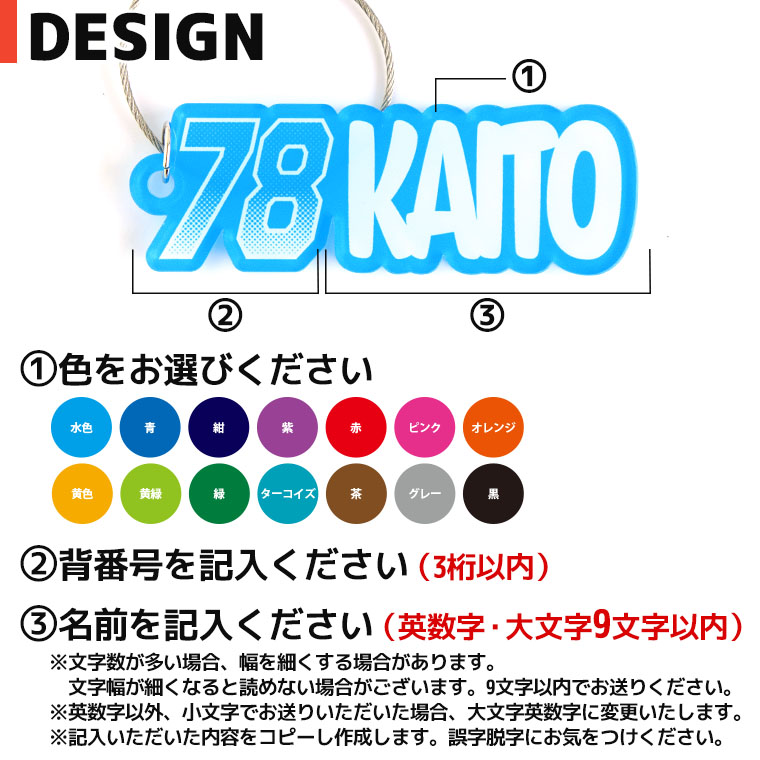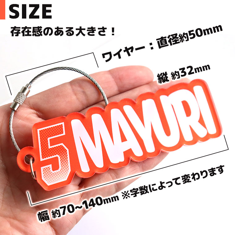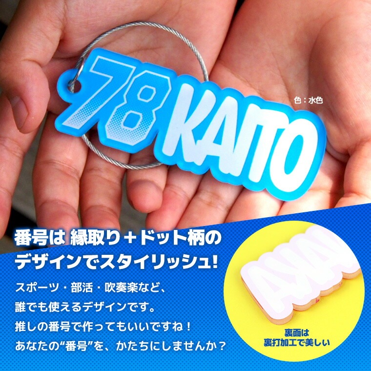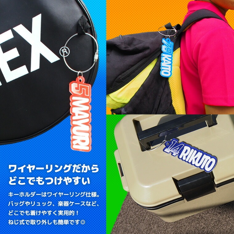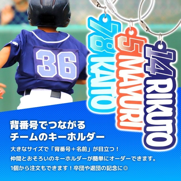 「番号+名前」の組み合わせで、チーム感UP! 部活・吹奏楽など、スポーツ以外使えるデザインです。 卒団記念や大会前のプレゼントにもおすすめです。 名前と番号を入力するだけで簡単にオーダーできます! キーホルダーはワイヤーリング仕様。 バッグやリュック、楽器ケースなど、どこでも着けやすく実用的! ねじ式で取り外しも簡単です◎ |