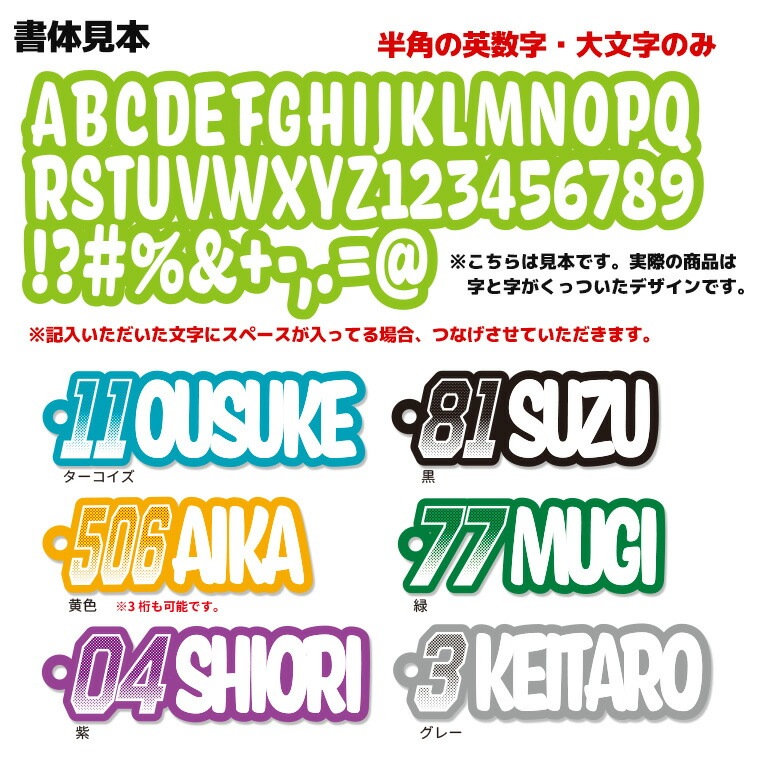 ※英数字以外または小文字、全角でお送りいただいた場合、大文字英数字の半角に変更いたします。 ※画像は閲覧環境により実際のお色と異なる場合がございます。あらかじめご了承ください。 ※文字の配置やサイズはこちらでバランスを見て調整いたします。 ※アルコールやシンナーなどの薬品が付着した場合色落ちの原因となります。 |