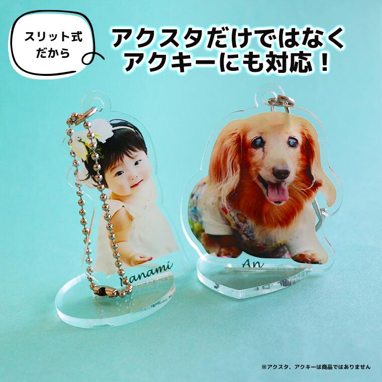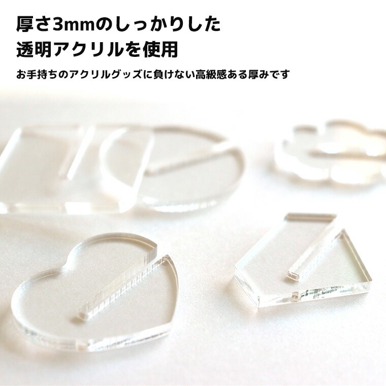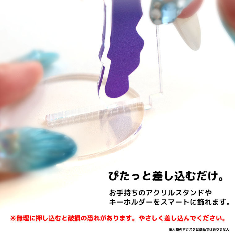 | 商品について | スリット式で、いろんなサイズにフィット! アクスタもキーホルダーも差し込むだけ。 スリットの幅は奥に向かってほんの少しずつ狭くなる構造で、厚みに個体差があるアクリルグッズにもフィットします。 |