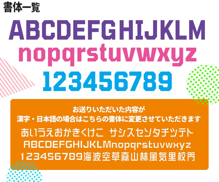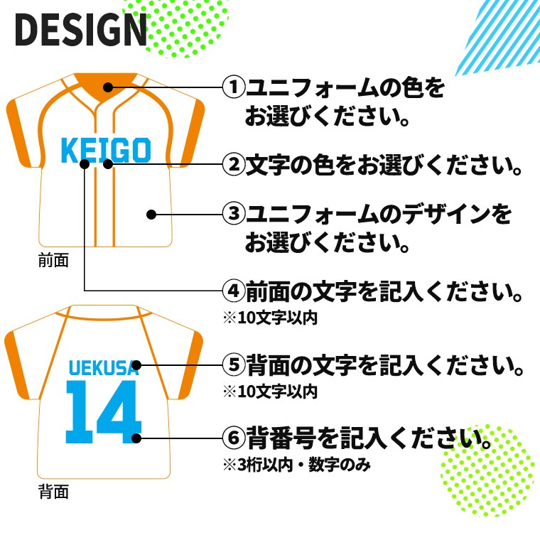 | オーダー内容 | ①前面の文字(10文字まで) ②背面の文字(10文字まで) ③背番号(3桁まで) ※上記はご注文手続き時にご記入ください。 |