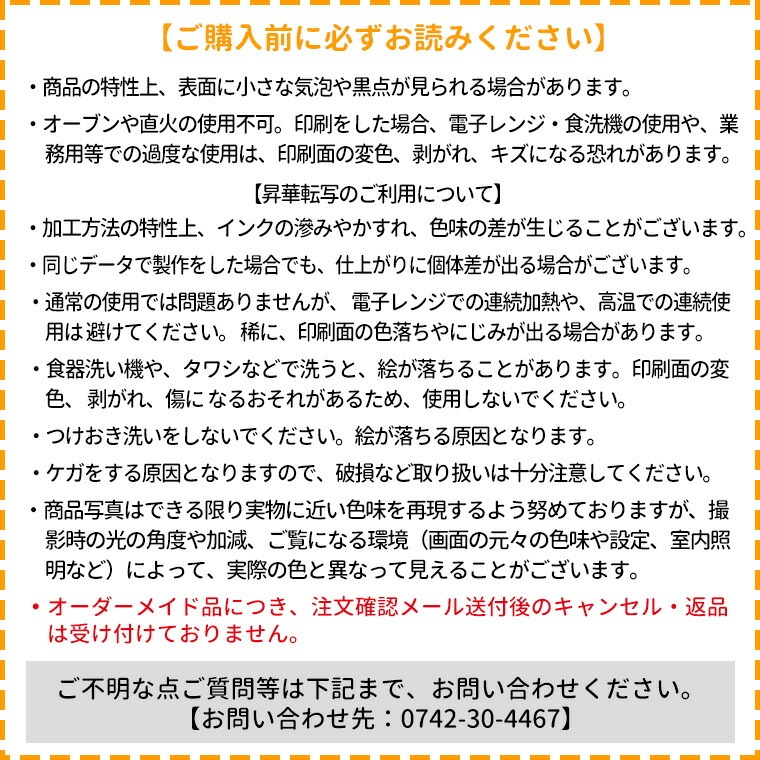 ※商品の特性上、表面に小さな気泡や黒点が見られる場合があります。 ※オーブンや直火の使用不可。印刷をした場合、電子レンジ・食洗機の使用や、業務用等での過度な使用は、印刷面の変色、剥がれ、キズになる恐れがあります。 ※画像は閲覧環境により実際のお色と異なる場合がございます。あらかじめご了承ください。 ※オーダーメイド品につき、注文確認メール送付後のキャンセル・返品は受け付けておりません。 |