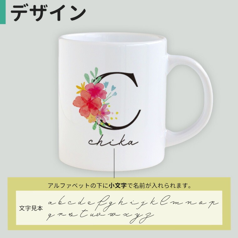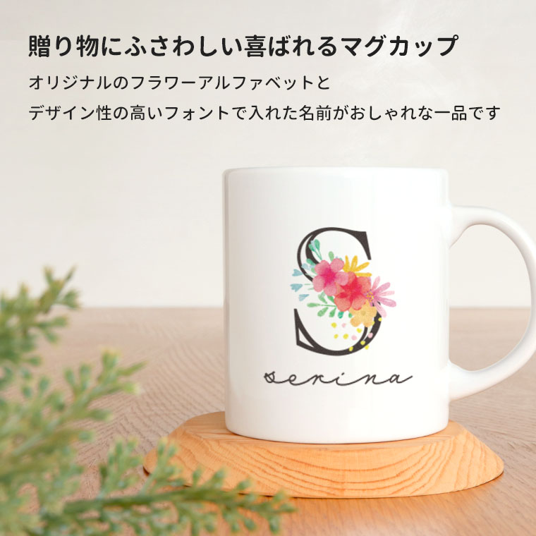 | 商品について | 毎日ちょうどいい。たっぷり310mlの定番マグ。 お花をあしらったアルファベットとおしゃれなフォントで入れるお名前で作るオリジナルのデザイン! お誕生日・記念日・お祝いに、世界でひとつだけのギフトを。 |