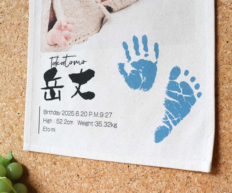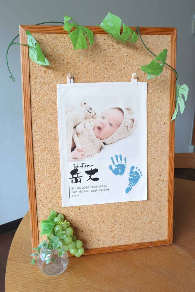 出産祝いのタペストリーのご注文をいただきました。赤ちゃんの手形・足型・写真と名前・体重・身長をタペストリーでギフトに。