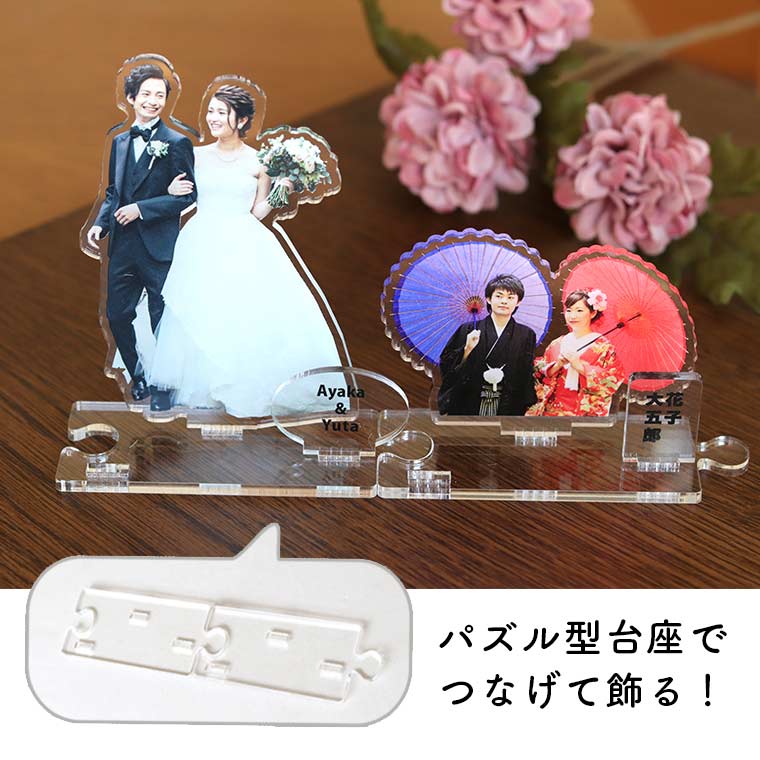| 商品について | 写真を送るだけで名前入りオリジナルのフォトスタンドが完成! 結婚式のウェルカムアイテムにピッタリ! 使用後はお部屋のインテリアとして飾れます♪ つながる台座なので、記念日を迎えるごとに増やしていけます。 |
