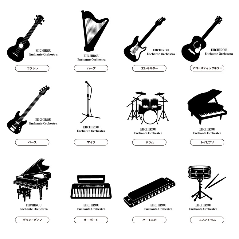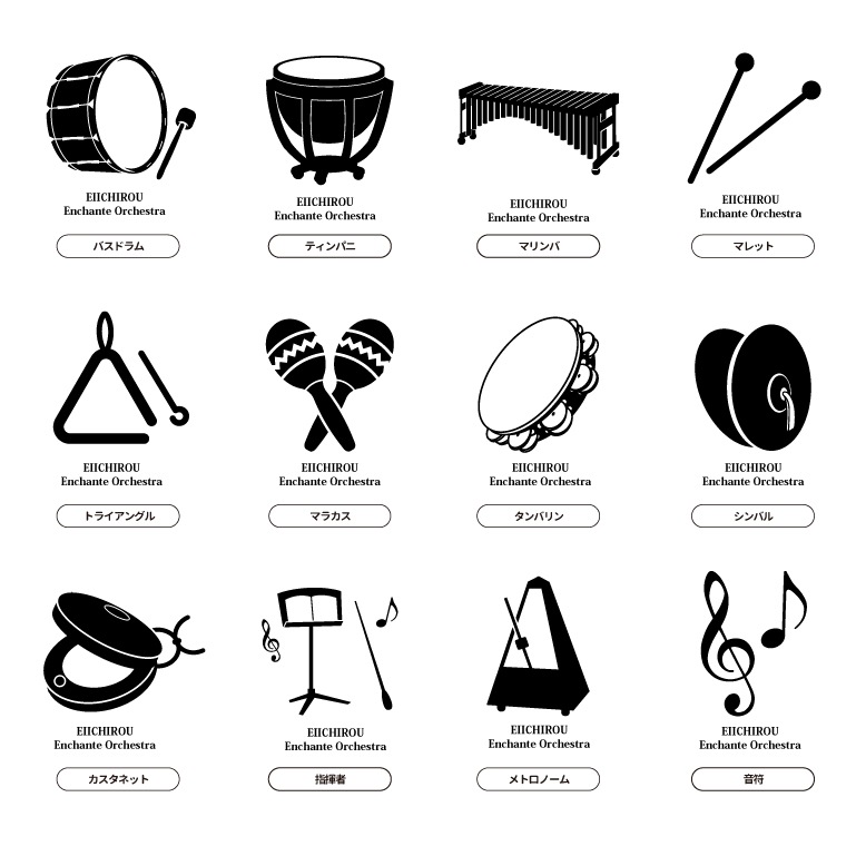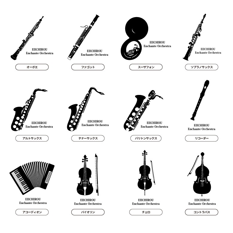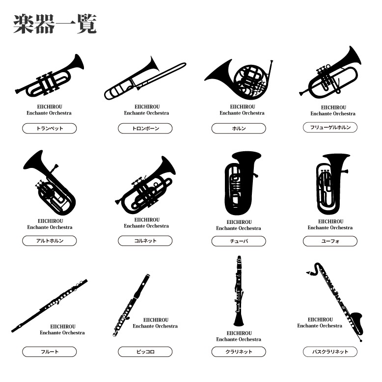 | 種類 | トランペット/トロンボーン/ホルン/フリューゲルホルン/アルトホルン/コルネット/チューバ/ユーフォ/フルート/ピッコロ/クラリネット/バスクラリネット/オーボエ/ファゴット/スーザフォン/ソプラノサックス/アルトサックス/テナーサックス/バリトンサックス/リコーダー/バイオリン/チェロ/コントラバス/ウクレレ/ハープ/エレキギター/アコースティックギター/ベース/マイク/ドラム/トイピアノ/グランドピアノ/アコーディオン/キーボード/ハーモニカ/スネアドラム/バスドラム/ティンパニ/マリンバ/マレット/カスタネット/トライアングル/マラカス/タンバリン/シンバル/指揮者/メトロノーム/音符 |